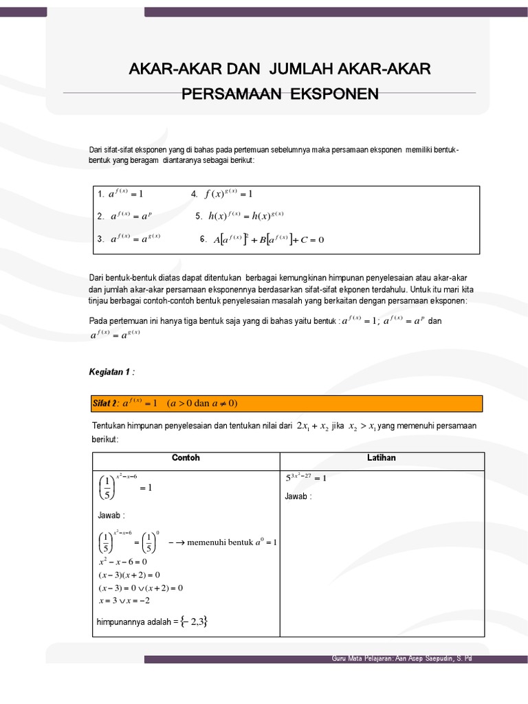 Persamaan eksponen adalah suatu persamaan yang pangkatnya bilangan pokoknya atau keduanya memuat suatu variabel. Akar akar dari persamaan kuadrat tersebut disubstitusikan ke dalam bentuk persamaan eksponen. Misalkan a 0 dan a 1. Blog koma persamaan eksponen merupakan persamaan yang melibatkan bentuk eksponen seperti sifat sifat eksponen dan bentuk akar yang dihubungkan dengan tanda sama dengan.