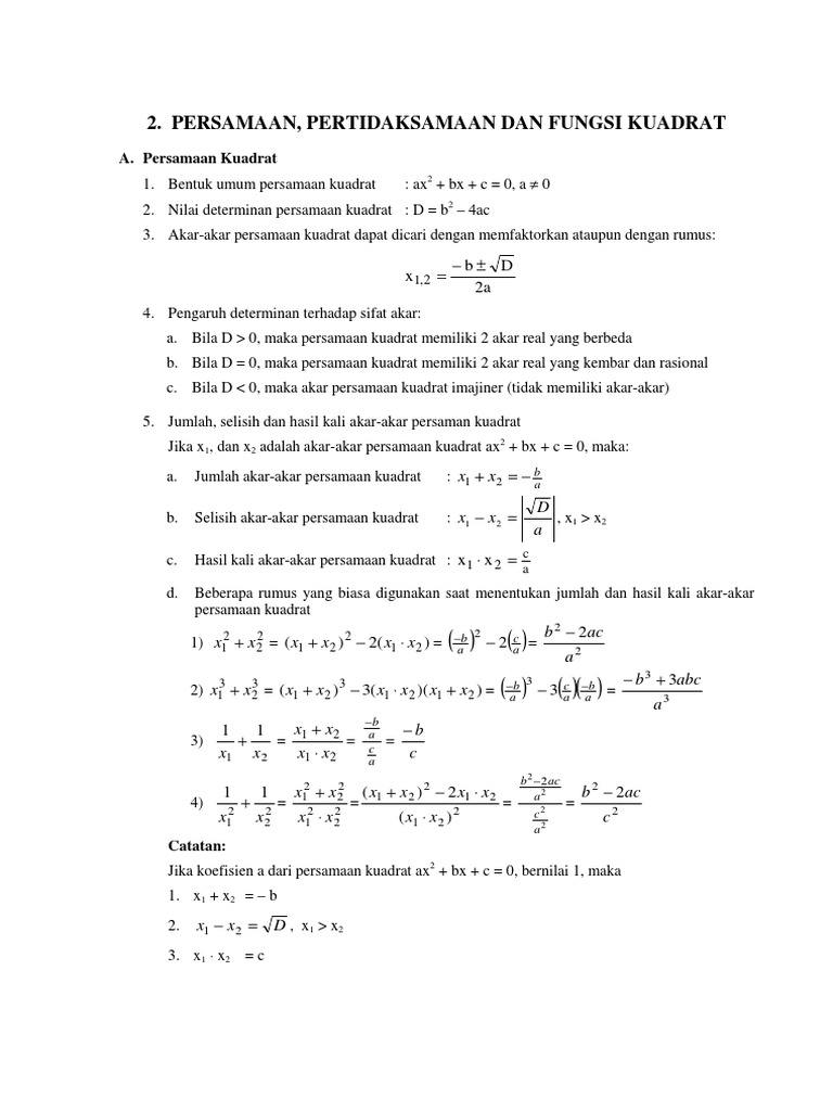 Sedangkan nilai akar persamaan bisa didapat dengan beberapa cara seperti faktorisasi kuadrat sempurna atau rumus abc. Definisi persamaan kuadrat persamaan kuadrat adalah persamaan dengan pangkat peubah tertingginya dua. Akar akar persamaan kuadrat sangat ditentukan oleh adanya nilai diskriminan d b 2 4ac di mana hal itu yang membedakan jenis akar akar persamaan kuadrat menjadi 3 diantaranya yaitu. Akar persamaan kuadrat ax 2 bx c 0 adalah nilai x yang memenuhi persamaan kuadrat tersebut.
