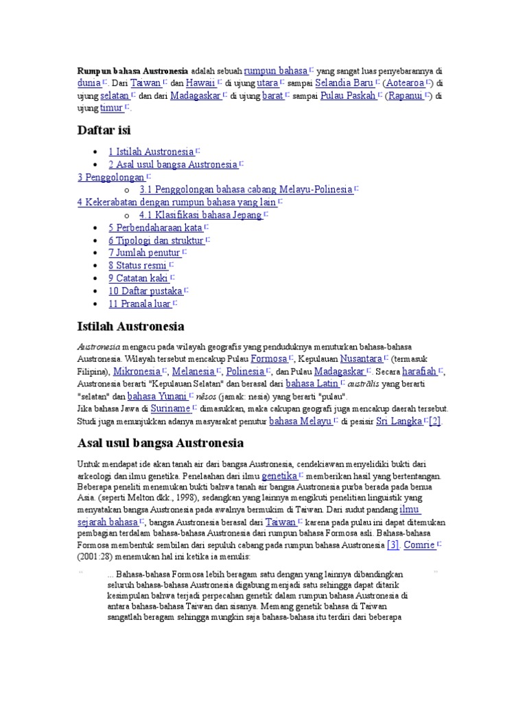 Menurut asmah haji omar 2008 istilah rumpun ditakrifkan sebagai satu kumpulan besar bahasa yang berasal daripada satu sumber yang menurunkan bahasa bahasa austronesia maka tidak hairanlah apabila ditemui banyak persamaan antara bahasa serumpun. Menurutnya orang yang hidup di wilayah indonesia polinesia melanesia dan mikronesia memiliki kemiripan bahasa yakni bersumber dari rumpun austronesia berasal dari. Kebanyakan bahasa bahasa austronesia tidak mempunyai sejarah panjang dalam bentuk tertulis sehingga upaya untuk. Sekitar 4500 3000 sm ada satu kelompok leluhur yang memisahkan diri dan bermigrasi ke filipina bagian utara.