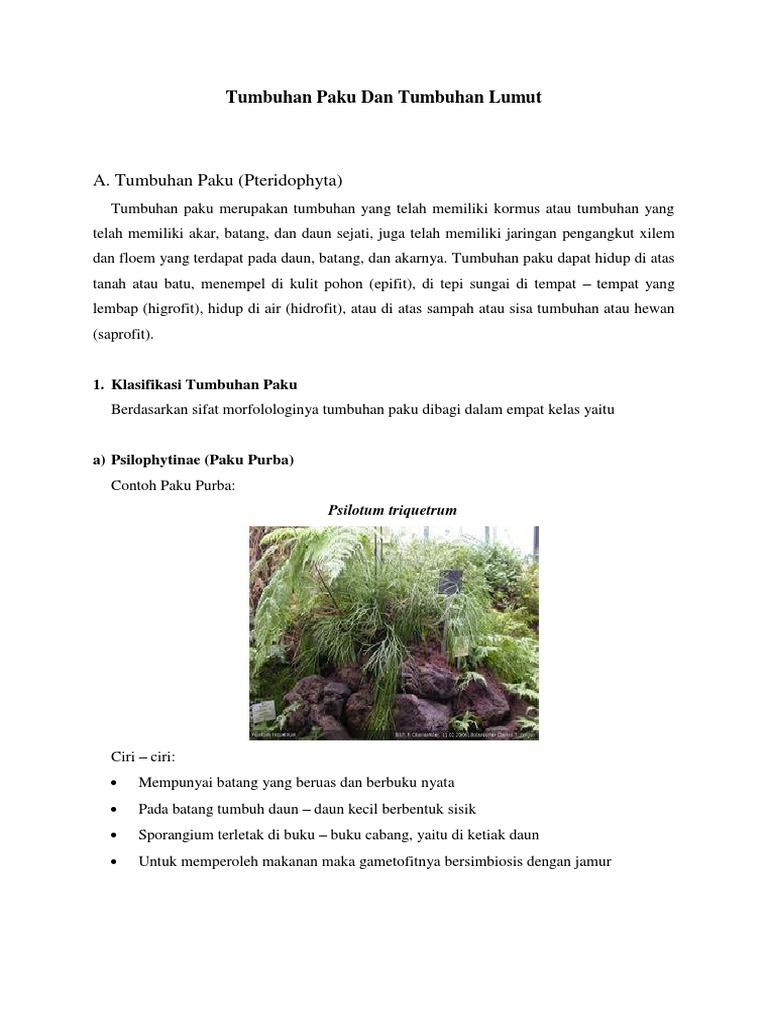 Tumbuhan paku termasuk tumbuhan yang berpembuluh memiliki daun batang dan akar yang terdapat daun tumbuhan paku memiliki berkas pengangkut xilem dan floem. Struktur tubuh lumut memiliki tubuh tanaman berdaun atau taloid sedangkan pada paku tubuh tanaman di bedakan menjadi akar batang dan daun. Bentuk akar tumbuhan lumut adalah akar serabut. Klasifikasi pada tumbuhan paku meliputi lycophyta paku kawat sphenophyta paku ekor kuda dan pterophyta paku sejati.