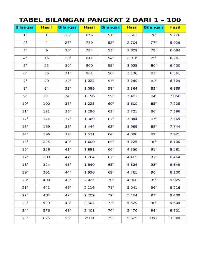 Untuk diatas hanya contoh. 2 2 4 3 2 9 4 2 16 5 2 25 6 2 36 7 2 49 8 2 64 9 2 81 10 2 100. Contoh akar pangkat dua dari 64 adalah 8. Dan inilah yang harus dihafal.