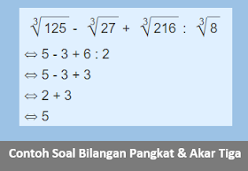 Akar kuadrat adalah invers dari pangkat kuadrat. Untuk memperoleh hasil tersebut kita harus ingat lagi 10 bilangan kubik pertama. Pangkat tiga dari 3 adalah 27 ditulis 3 3 27 pangkat tiga dari 4 adalah 64 ditulis 4 3 64 pangkat tiga dari 5 adalah 125 ditulis 5 3 125 pangkat tiga dari 6 adalah 216 ditulis 6 3 216 hasil pangkat tiga suatu bilangan disebut juga kubik. Akar pangkat tiga dari sebarang bilangan a dengan a 0 adalah negatif.