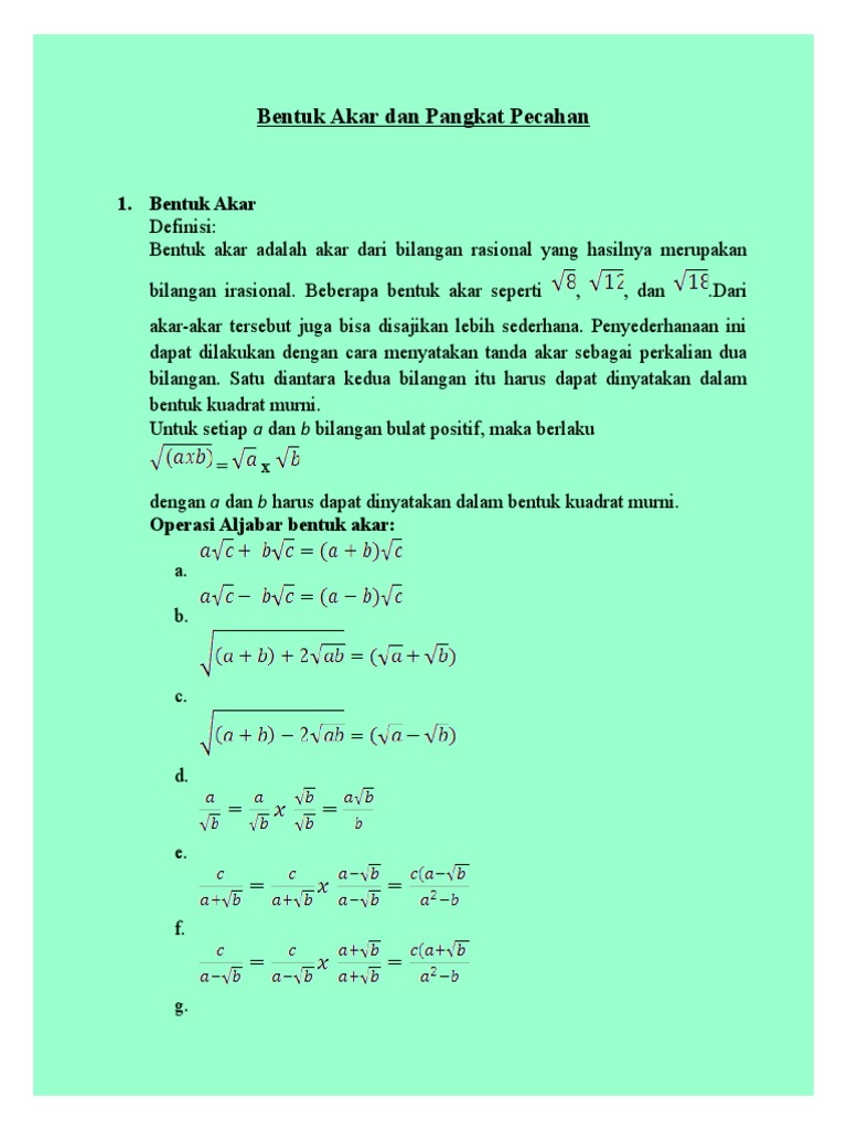 Bilangan bentuk akar merupakan bilangan yang terdapat di dalam tanda disebut tanda akar. Batasan bilangan rasional yaitu mulai dari selanga. Bentuk akar adalah salah satu contoh bilangan irasional yakni bilangan yang tidak bisa dinyatakan ke dalam bentuk a b dengan ketentuan a dan b merupakan bilangan bulat di mana b 0. Bilangan bulat bilangan asli bilangan cacah bilangan prima dan bilangan bilangan lain yang menjadi subset dari bilangan rasional tersebut.