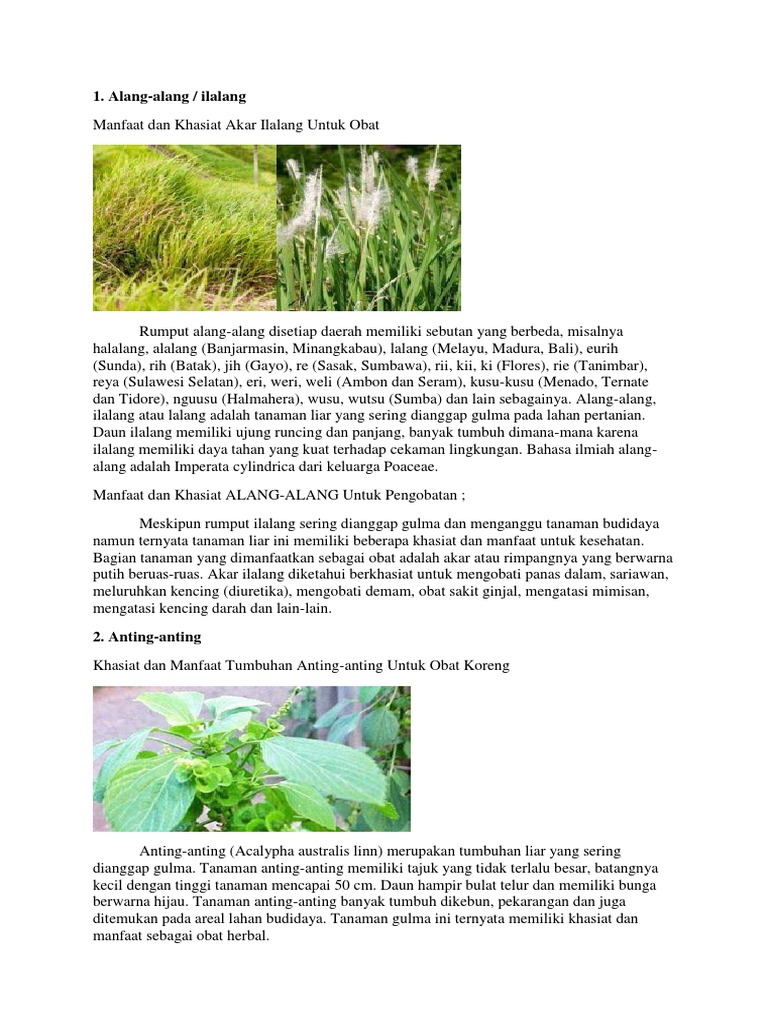Tanaman yang juga disebut dengan ilalang ini termasuk rumput yang penyebarannya sangat mudah menggunakan bantuan angin. Akar alang alang merupakan akar tanaman herbal yang biasa digunakan untuk obat herbal. Mengobati demam dan kencing berdarah selain bermanfaat sebagai peluruh air seni khasiat lain dari akar tanaman alang alang ini untuk kesehatan adalah mengobati demam akibat kencing berdarah. Menurut uji klinik akar alang alang dengan dosis 250 300 g 2 kali pagi dan sore dapat menyembuhkan 27 kasus dari 30 penderita nefritis akut.