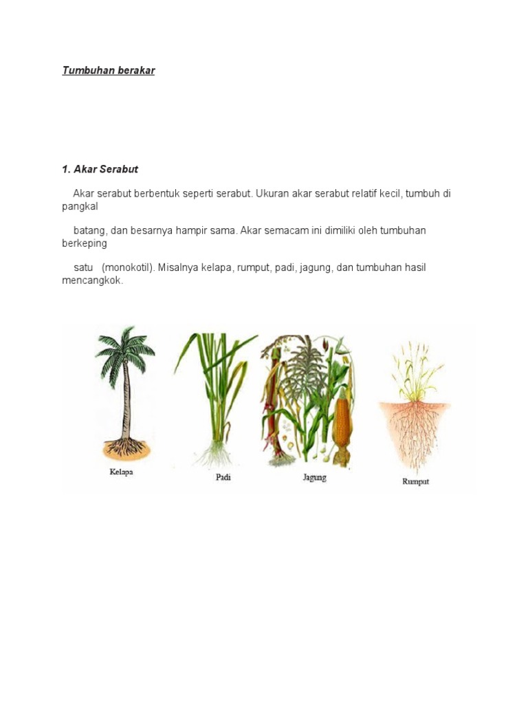 Misalnya kelapa rumput padi jagung dan tumbuhan hasil mencangkok. Akar serabut monokotil karena tumbuhan berkeping satu akar serabut mempunyai karakter akar yang berbentuk serabut tidak beraturan tetapi memiliki rongga untuk berinteraksi dengan oksigen diudara. Cabang akarnya memang tidak menjadi besar tetapi nantinya akan tumbuh akar akar yang lain di sekelilingnya. Akar serabut umumnya dimiliki oleh tumbuhan berkeping satu monokotil.