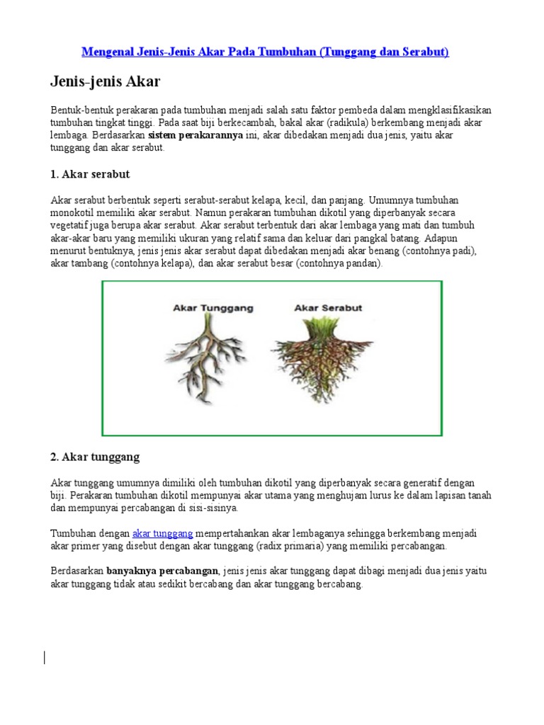 Sistem dari akar dikotil yang tunggang diakibatkan oleh akar kecambahnya merasakan pertumbuhan secara terus menerus unsur pangkal akar memiliki ukuran yang lebih banyak dari unsur ujung akar utama tetapi meskipun tunggang akarnya itu tetap memiliki cabang meskipun tidak serabut. Memiliki biji berkeping dua 2. Akar monokotil adalah akar adventif seperti rambut yang tidak memiliki akar tunggang. Pengelompokkan tumbuhan biasanya didasarkan pada suatu bagian tumbuhan misalnya bagian akar terbagi atas akar tunggang dan akar serabut.