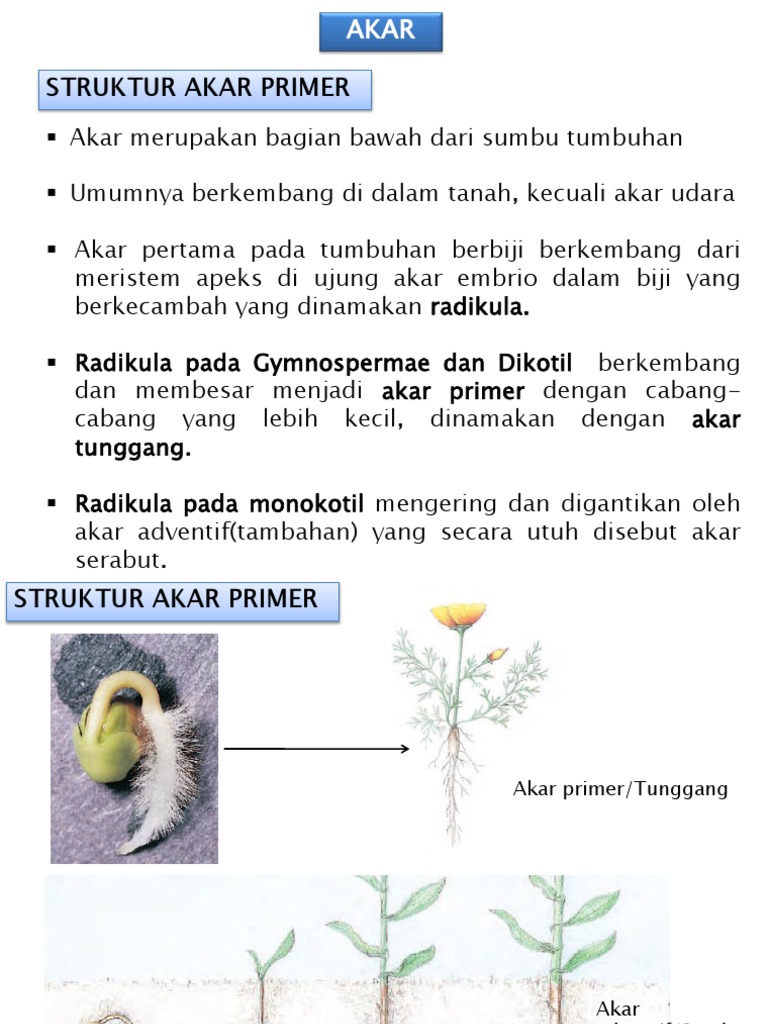Calon akar yang tumbuh menjadi akar disebut akar primer sedangkan pertumbuhan akar akibat aktifitas kambium akan mebentuk akar sekunder.