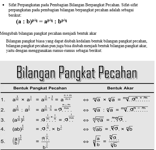 Bilangan berpangkat pecahan pengertian sifat rumus contoh soal dipembahasan sebelumnya kita sudah membahas materi mengenai bilangan berpangkat dan bilangan pecahan sekarang kita akan membahas materi bilangan berpangkat pecahan. Bilangan pangkat biasa yang bisa dirubah kedalam bentuk bilangan yang berpangkat pecahan bilangan pangkat pecahan itupun juga dapat diubah menjadi sebuah bentuk bilangan pangkat akar yakni dengan memakai rumus rumus sebagai berikut ini. Perhatikan bahwa untuk mengubah penyebut yang asalahnya bentuk akar menjadi bilangan rasional dibutuhkan pengali. Bentuk akar juga termasuk ke dalam bilangan irasional yang dimana dengan menggunakan bilangan pecahan a b a serta b bilangan bulat a dan b 0.