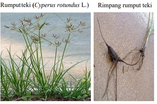 Rumput teki atau kadang disebut mota koreha wai rukut teki atau rukut wuta adalah rumput palsu yang dapat hidup sepanjang tahun dengan ketinggian kira kira 10 sampai dengan 75 cm. Akar rumput teki merupaakan perakaran serabut dan akarnya berwarna putih kotor. Kulit umbi rumput teki berwarna hitam dan pada bagian dalamnya memiliki warna putih kemerahan. Akar rumput teki biasanya berwarna putih dengan diameter sebesar 25mm.