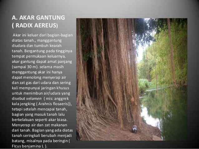 Maka dari itu menjaga kelestarian tanaman atau pohon sangat penting. Akar gantung tersebut mempunyai fungsi guna menyerap uap air serta gas yang ada di udara. Akar gantung tumbuh dari bagian batang di atas tanah ke arah tanah. Akar gantung atau akar udara radix aereus.