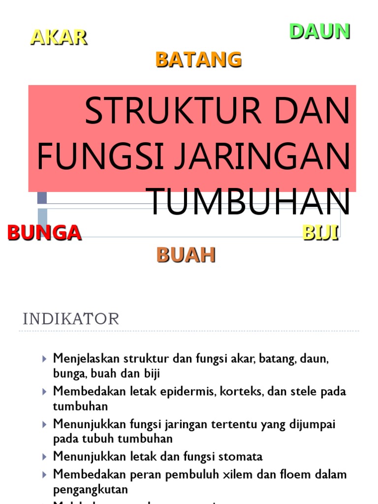 Struktur dan fungsi dari akar batang daun dan bunga. Zat makanan yang diproduksi daun juga diedarkan batang ke bagian lainnya. Batang mengangkut zat hara dan air dari akar ke daun. Akar batang daun bunga buah dan biji mempunyai struktur dan fungsi yang berbeda.