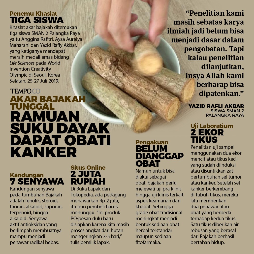Kayu bajakah awalnya hanya dikenal sebagai tanaman yang dianggap mistis oleh masyarakat kalimantan. Wajar saja dari beratus tahun sejak dikenalnya dunia medis kanker. Namun dengan banyak dibukanya hutan untuk lahan pertanian dan perkebunan tanaman kayu bajakah menjadi kian langka kemudian tiga orang siswa sman 2 palangkaraya kalimantan tengah melakukan penelitian terhadap kayu bajakah dan penelitian tersebut tak hanya berhasil mengharumkan nama indonesia di. Akar tanaman bajakah sendiri sudah digunakan masyarakat setempat sejak turun temurun bahkan salah satu warga yang mengidap kanker payudara stadium empat telah merasakan khasiat dari bajakah.