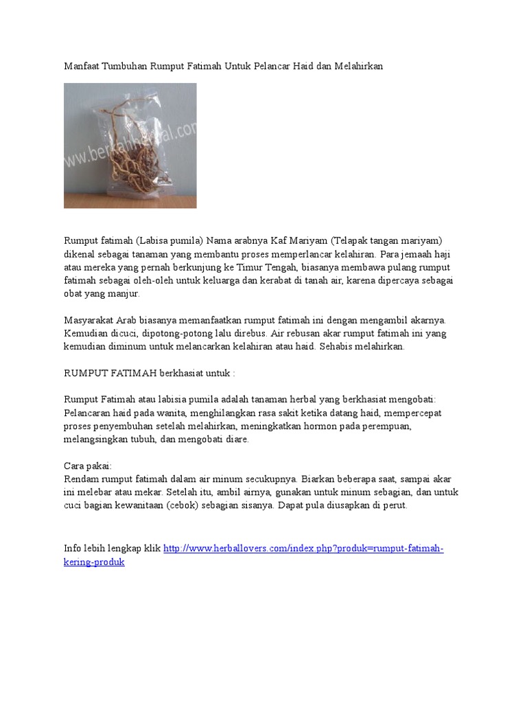 Saya minum satu gelas besar rendaman rumput fatimah yang diberi air panas ujarnya. Minum rendaman akar rumput fatimah ini akan menimbulkan masalah jika mulut rahim belum terbuka efek kuat kontraksi ini adalah berbahaya. Rumput atau akar fatimah punya nama latin sebagai labisa pumila. Sebelumnya telah disinggung bila manfaat rumput fatimah bisa meningkatkan jumlah reseptor oksitoksin.