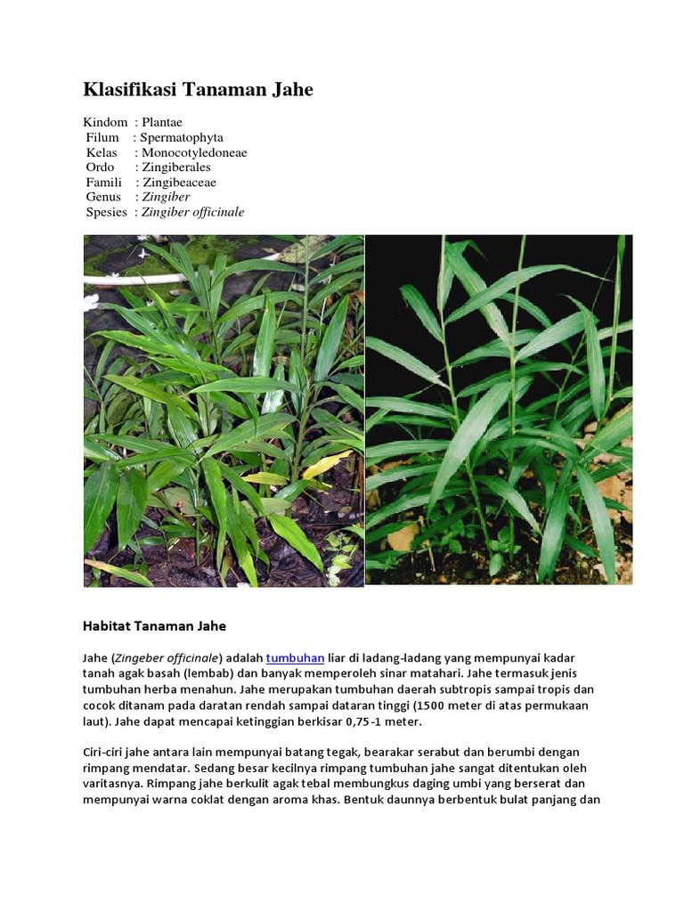 Tumbuhan jahe merupakan salah satu tanaman rempah penting memiliki rimpang yang sangat bermanfaat antara lain sebagai bahan bumbu masak memberi aroma serta rasa pada makanan seperti biscuit roti kue kembang gula dan berbagai minuman yang berbahan dasar dari jahe. Oleh karena itu negara ini yang pertama kali memanfaatkan jahe sebagai minuman obat dan herbal bumbu masak dan lainnya. Tanaman jahe merupakan tanaman yang telah lama dikenal dan tumbuh baik di indonesia. Akar merupakan bagian terpenting dari tanaman jahe.