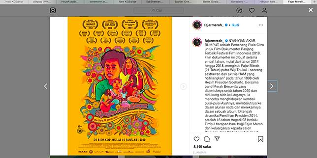 Film dokumenter ini dibuat selama empat tahun mulai dari tahun 2014 hingga 2018 mengikuti fajar merah 21 tahun putra wiji thukul seorang sastrawan dan aktivis ham yang dihilangkan pada tahun 1998 oleh rezim presiden soeharto. Nyanyian akar rumput 2018 nonton streaming full movie halo sobat lihatsinopsis pada artikel yang anda baca kali ini dengan judul nyanyian akar rumput 2018 kami telah mempersiapkan artikel ini dengan baik untuk anda baca dan ambil informasi didalamnya. Fajar merah 21 tahun putra wiji thukul seorang sastrawan dan aktivis ham yang dihilangkan pada tahun 1998 oleh rezim presiden soeharto. Nyanyian akar rumput diambil dari judul puisi karya wiji thukul yang ditulis pada tahun 1988.