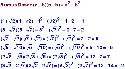 Cara merasionalkan setiap penyebut berlainan. Cara untuk merasionalkan penyebut pecahan yaitu dengan mengalikan pembilang dan penyebut pecahan tersebut dengan bentuk akar yang sekawan dari penyebut tersebut. 2 bentuk akar atau lebih dapat dijumlahkan atau dikurangkan jika bentuk akar2 tersebut sejenis. Pembahasan dimisalkan dulu kita namakan p saja kuadratkan ruas kiri kuadratkan ruas kanan.