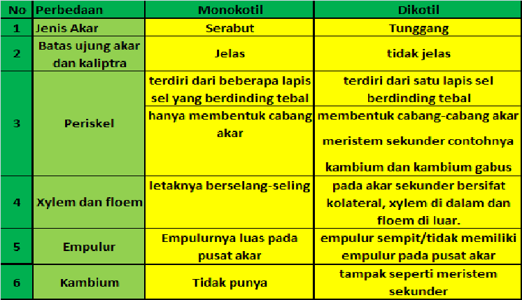 Secara umum tumbuhan dikotil dan monokotil dapat dibedakan dengan jelas. Inilah 7 perbedaan monokotil dan dikotil tabel. Namun demikian khusus pada struktur akar monokotil terdapat perbedaan diantaranya. 2015 08 20 pukul 17 58.