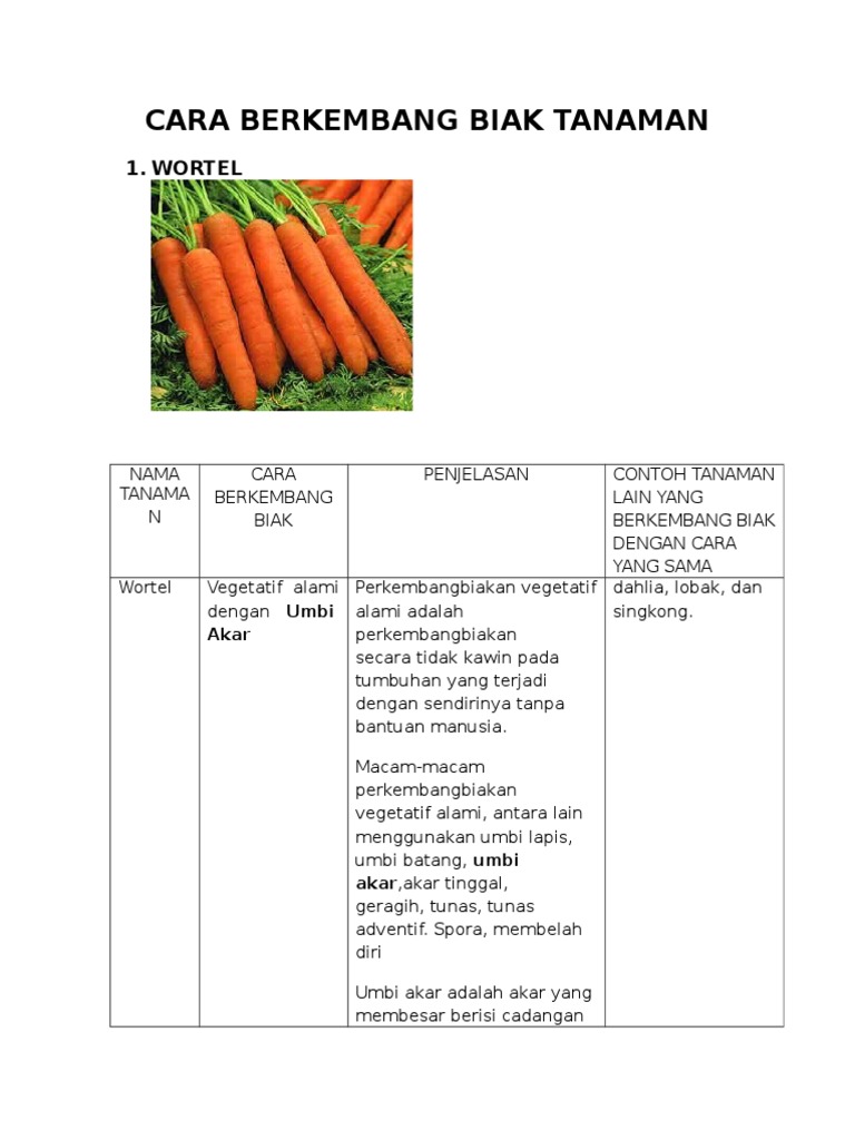 Contoh umbi dari akar tunggang adalah wortel dan lobak. Perkembangbiakan vegetatif hanya melibatkan satu induk saja. Tanaman yang berkembang biak secara vegetatif dan keterangannya perkembangbiakan secara vegetatif adalah cara perkembangbiakan makhluk hidup yang terjadi tanpa melalui perkawinan. Jika umbi ini ditanam bersama dengan pangkal batang maka akan tumbuh tunas.