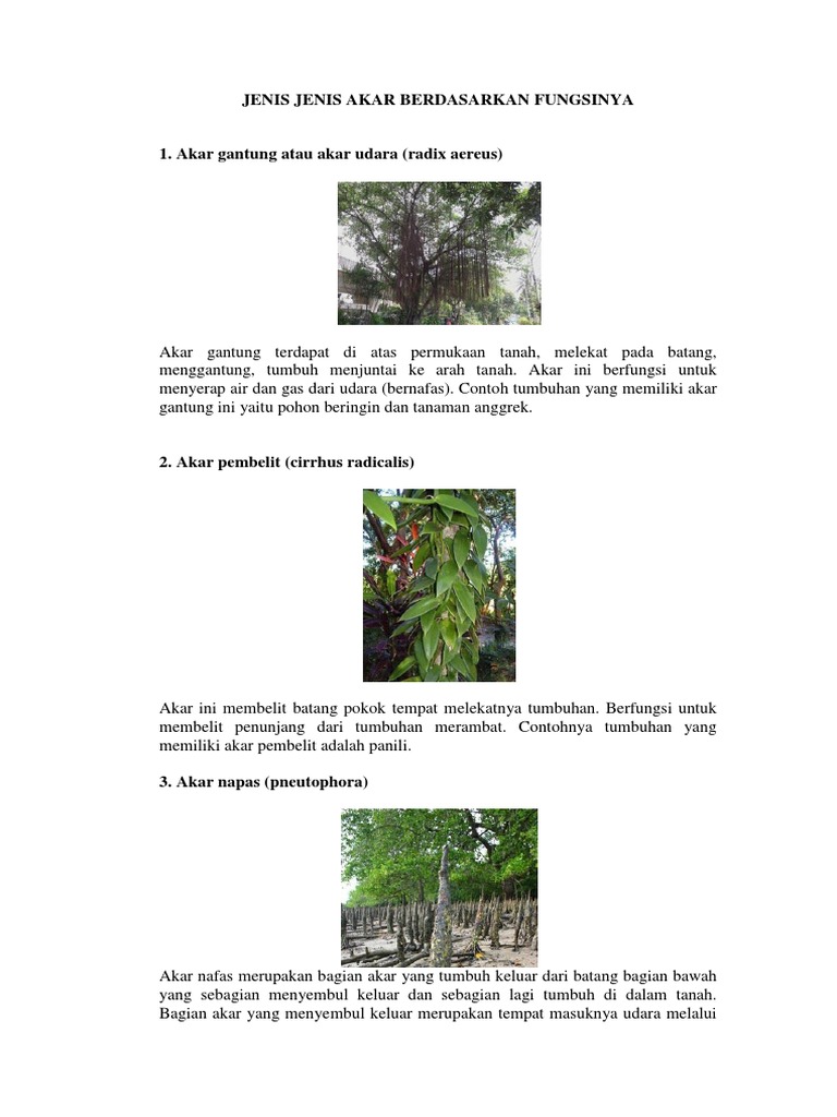 Tumbuhan yang memiliki akar gantung misalnya beringin. Akar napas berguna untuk keluar masuknya udara pernapasan pada tumbuhan. Akar jenis ini tumbuh ke segala arah dan. Akar napas akar napas adalah akar yang tumbuh keluar dari batang pada bagian bawah.